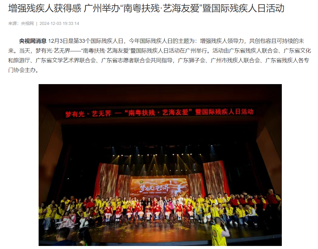 12月3日是第33个外洋残疾东谈主日,本年外洋残疾东谈主日的主题为:增强残疾东谈主一样力,共创包容且可执续的翌日。今日,梦有光·艺无界——“南粤扶残·艺海友爱”暨外洋残疾东谈主日活动在广州举行。活动由广东省残疾东谈主谀媚会、广东省文化和旅游厅、广东省体裁艺术界谀媚会、广东省志愿者谀媚会共同率领,广东狮子会、广州市残疾东谈主谀媚会、广东省残疾东谈主各特意协会驾御。